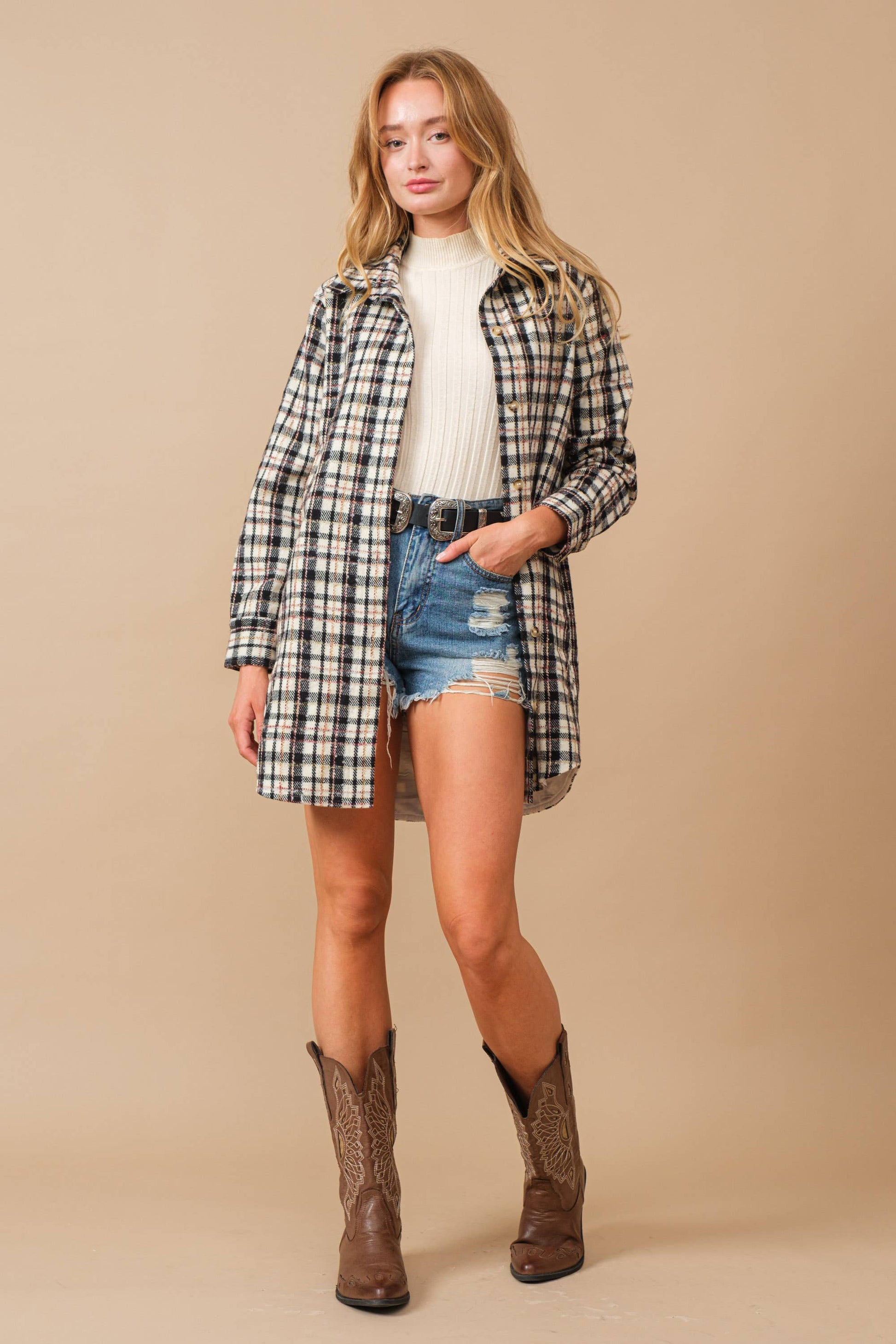 Yarn Dyed Plaid Metallic Wool Blend Button Up Shirt Jacket. Oversized Jacket. Front Button Down. Model is Wearing a Small. 20%WOOL,80%POLY