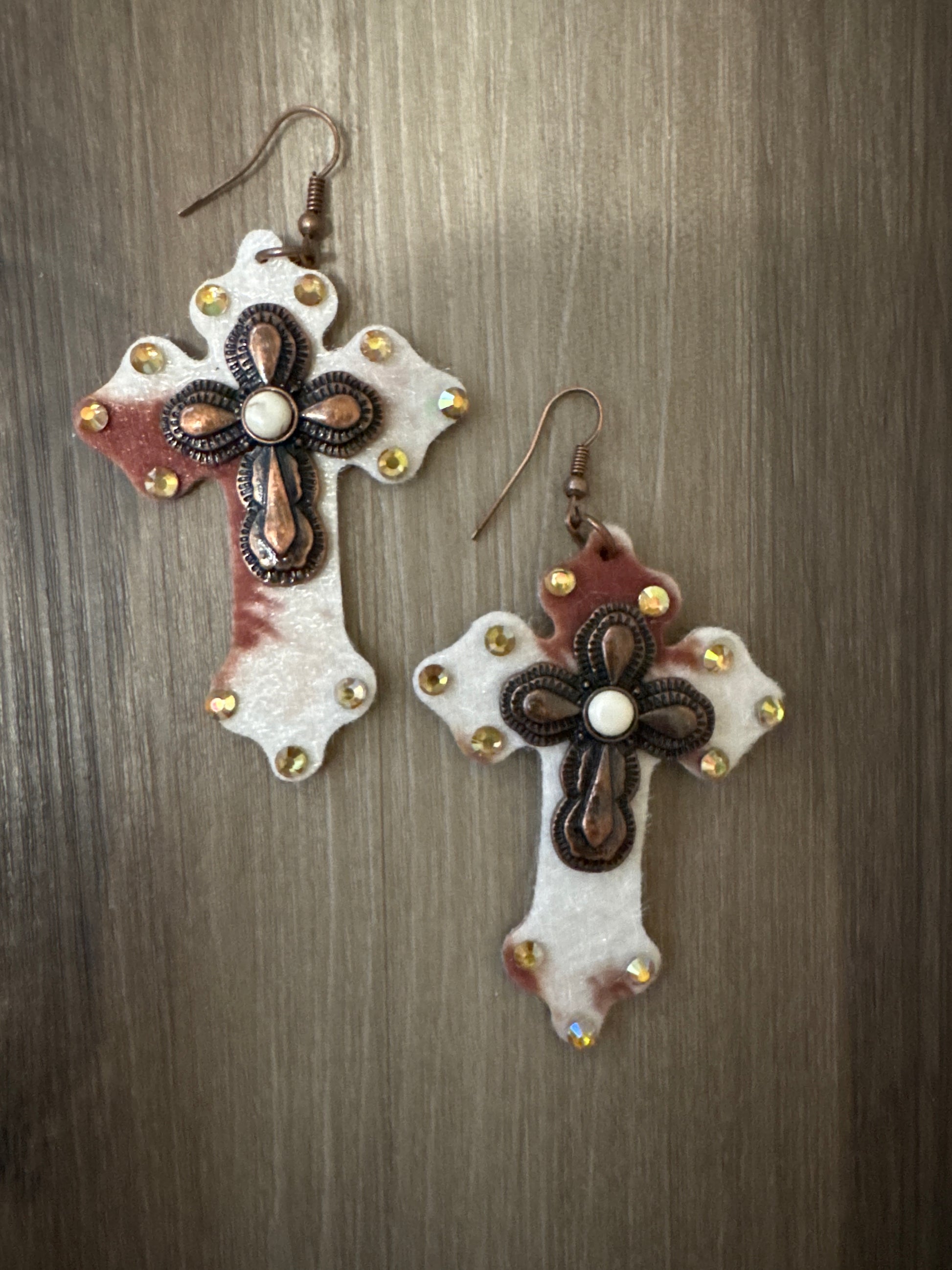 Animal Print Cross Earrings Faux Animal Hide with Rhinestone and Turquoise Accents Fish Hook 3" in Length.