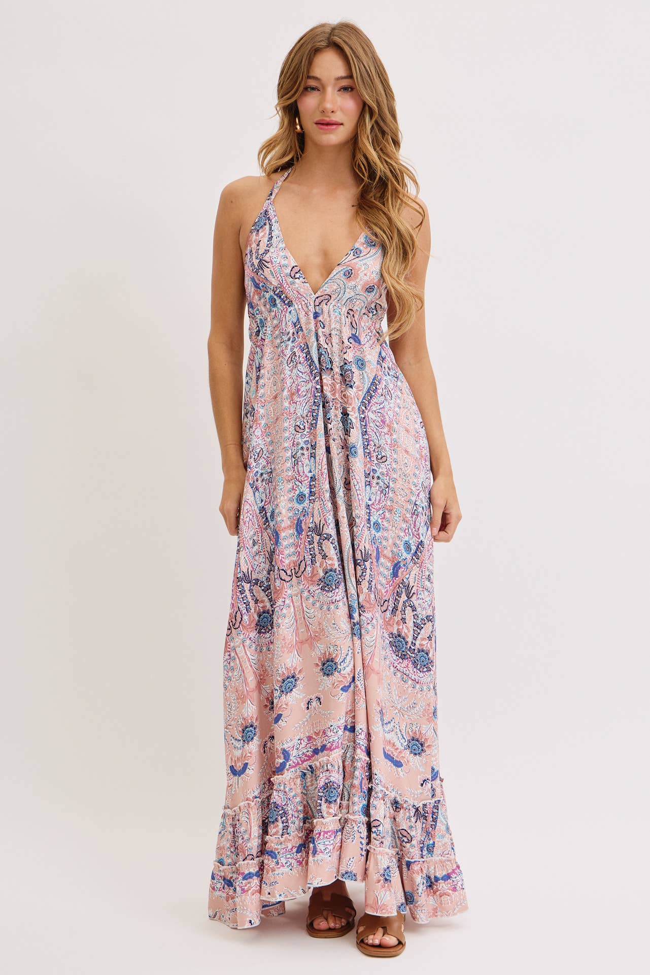 THIS STUNNING BOHEMIAN MAXI DRESS FEATURES A SOFT MAUVE BASE ADORNED WITH INTRICATE BLUE FLORAL AND PAISLEY PATTERNS. DESIGNED WITH V-NECKLINE AND A RELAXED, FLOWING SILHOUETTE, IT OFFERS A DREAMY AND ELEGANT LOOK PERFECT FOR SUMMER.