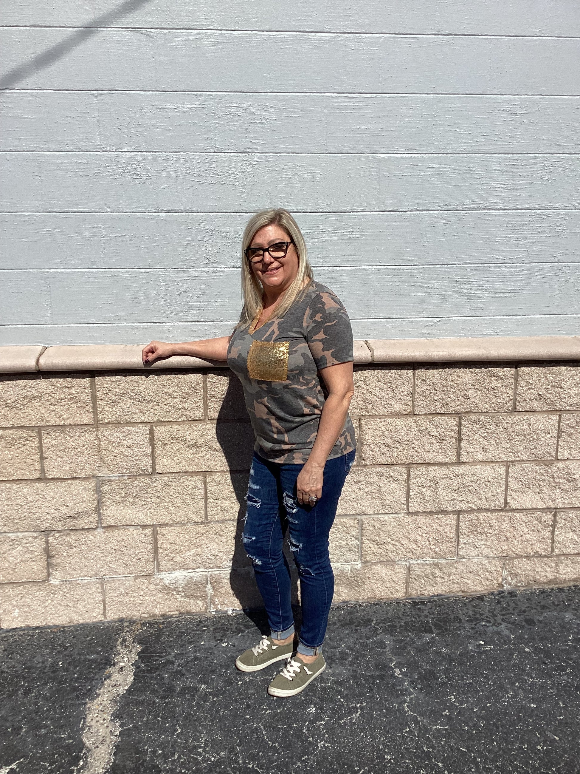 Description: Camo Printed Jersey Knit with Gold Sequins Pocket and Band Detailed Top. Model is wearing a Medium.Â
