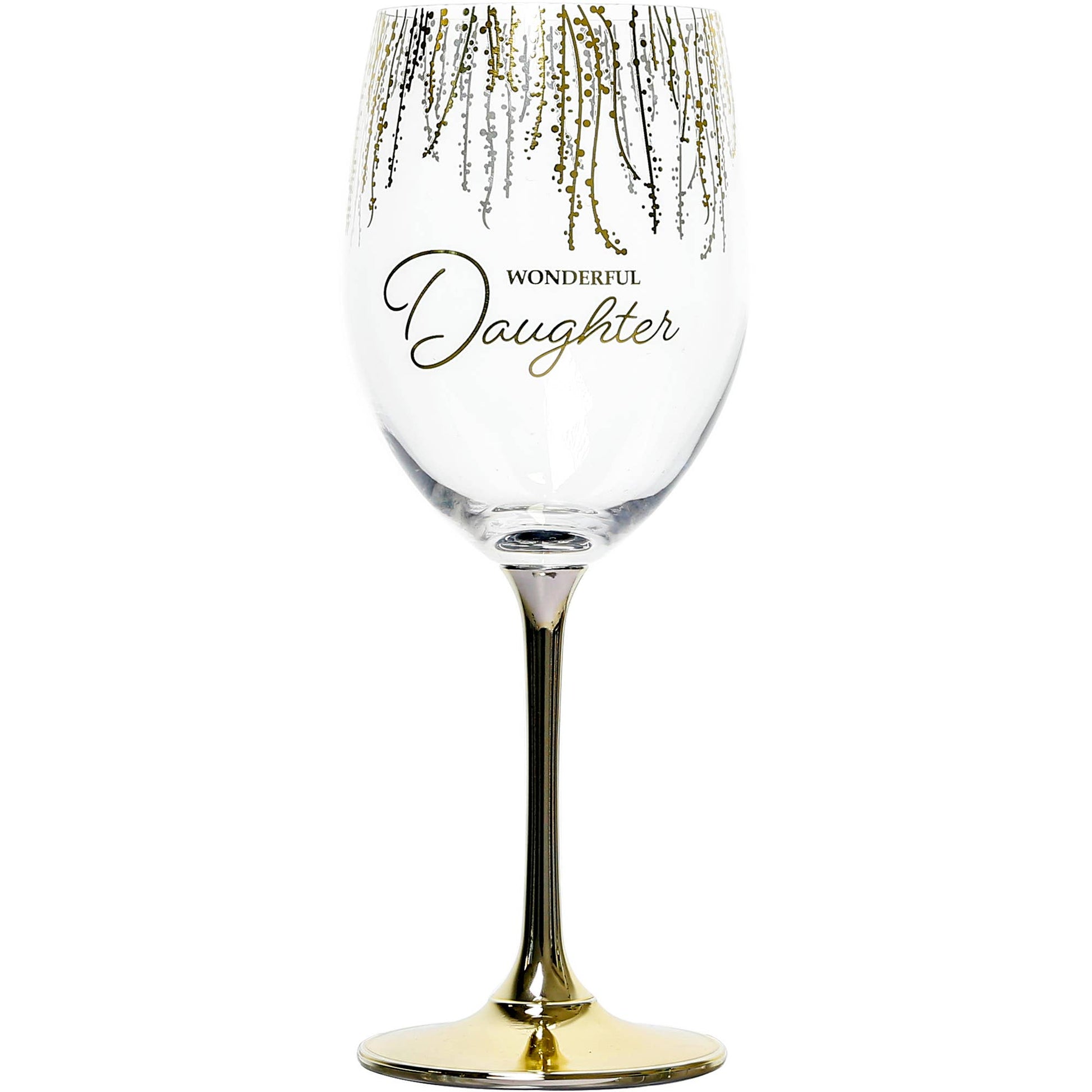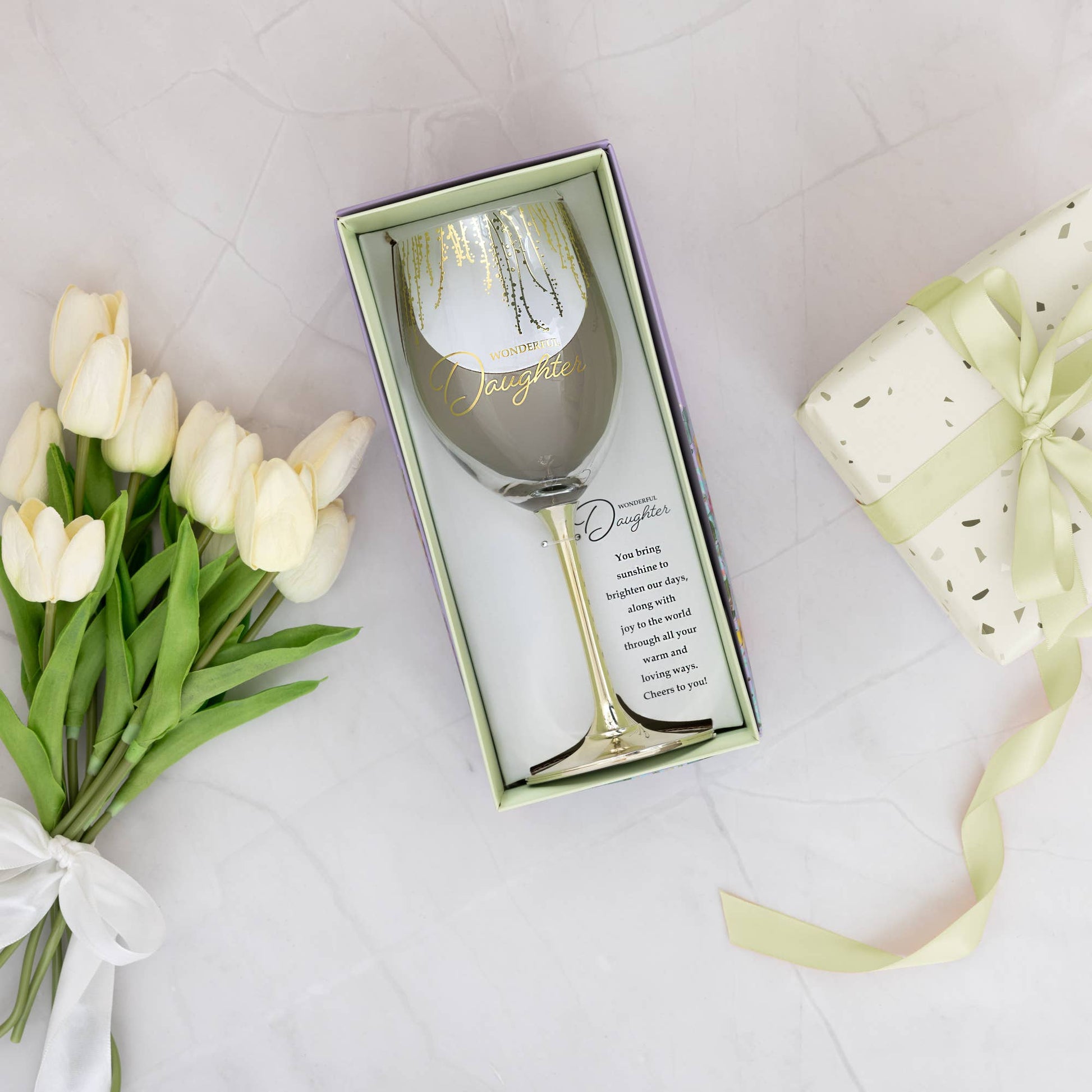 This unique 19 oz stemmed wine glass is made from crystal. This sturdy drinkware is terrific for celebratory events such as Daughter's Day. The metallic gold stem is sprayed, and the wrap-around golden floral vines hang from the rim of the glass. The "Wonderful Daughter" sentiment is placed on the front side of the glass. The gift box has a "Wonderful Daughter - You Bring Sunshine To Brighten Our Days, Along With Joy To The World Through All You Warm And Loving Ways. Cheers To You!" sentiment is heat-stamped in the bottom right. The high-quality box is cute to reuse for keepsakes or gifting another item to someone else. . Soft handwash only with mild soap and the soft side of the sponge. Do not leave soaking water. Dry immediately. It's packaged in a decorative gift box and secured with a twist tie.