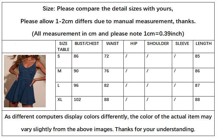 Denim Spaghetti Strap Dress Body Size: Missy. Pattern: Solid. Length: Sleeveless. Style: Loose Fit. Fabric: Cotton. Model is Wearing a Small.Â