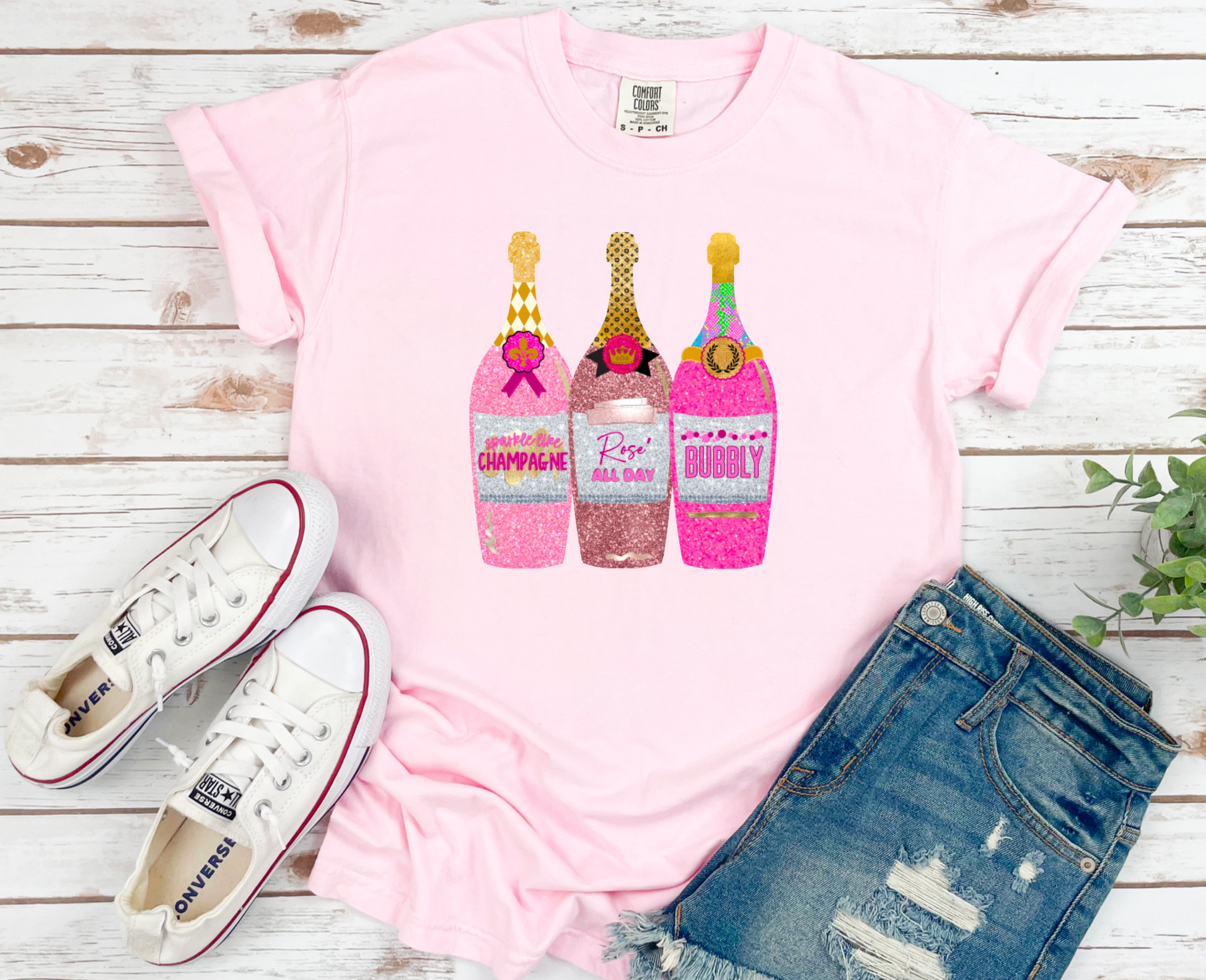 Faux Glitter Sparkly Champagne Graphic Tee T-Shirt. Party Shirt will Start the Party!Â