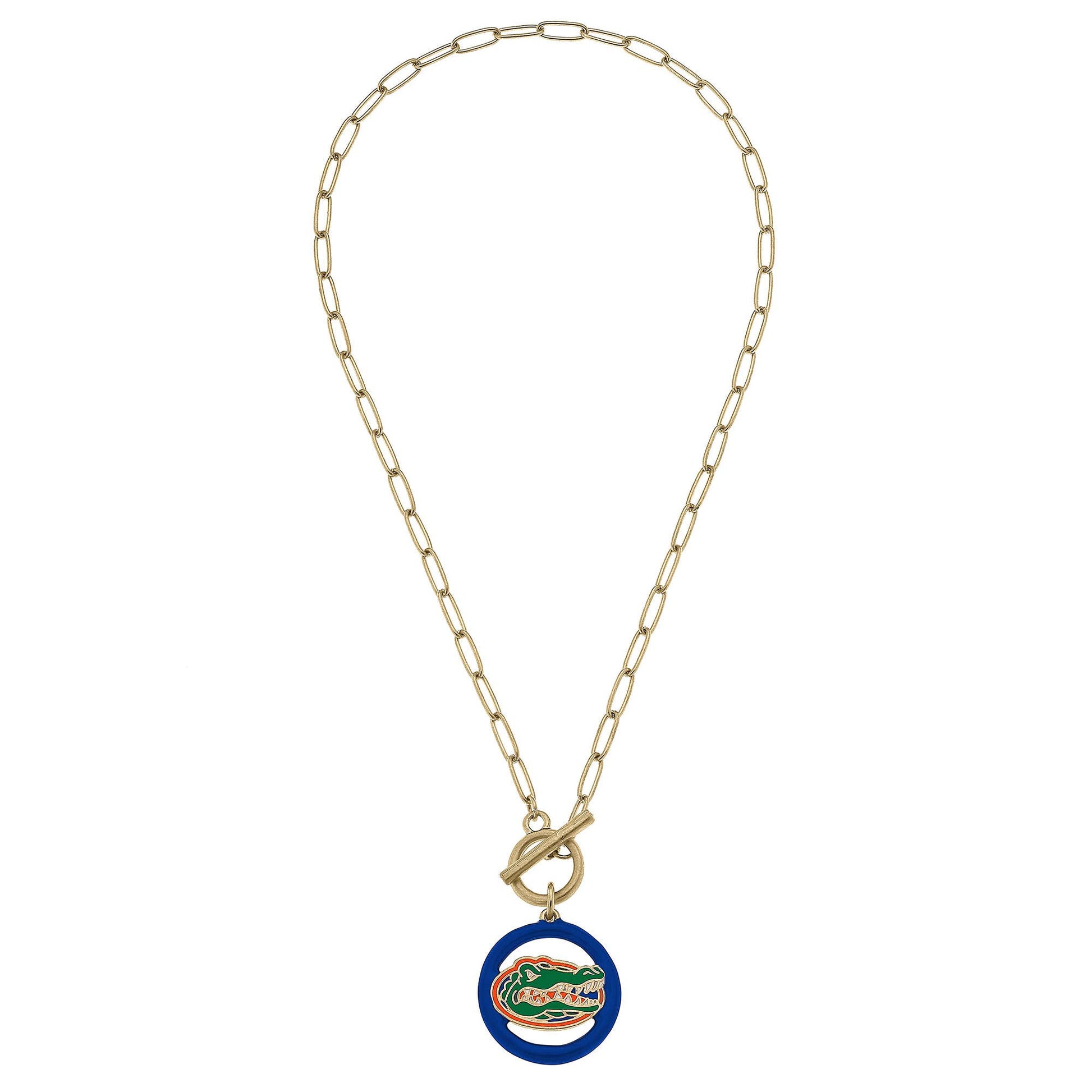 Show off your school spirit with our lightweight Florida Gators Enamel Logo T-Bar Necklace! Perfect for all-day wear, this necklace features the University of Florida logo in orange and blue.