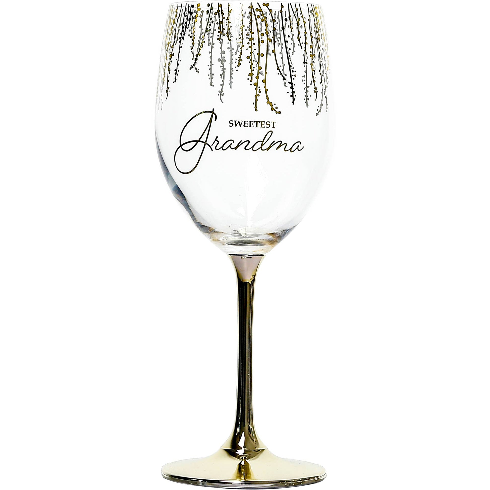 This unique 19 oz stemmed wine glass is made from crystal. This sturdy drinkware is terrific for celebratory events such as Grandparent's Day. The metallic gold stem is sprayed, and the wrap-around golden floral vines hang from the rim of the glass. The "Sweetest Grandma" sentiment is placed on the front side of the glass. The gift box has a "Sweetest Grandma - You Fill Our Lives With Love, Happiness, And Cherished Memories. Cheers To You!" sentiment is heat-stamped in the bottom right. The high-quality box is cute to reuse for keepsakes or gifting another item to someone else. Soft handwash only with mild soap and the soft side of the sponge. Do not leave soaking water. Dry immediately. It's packaged in a decorative gift box and secured with a twist tie. .