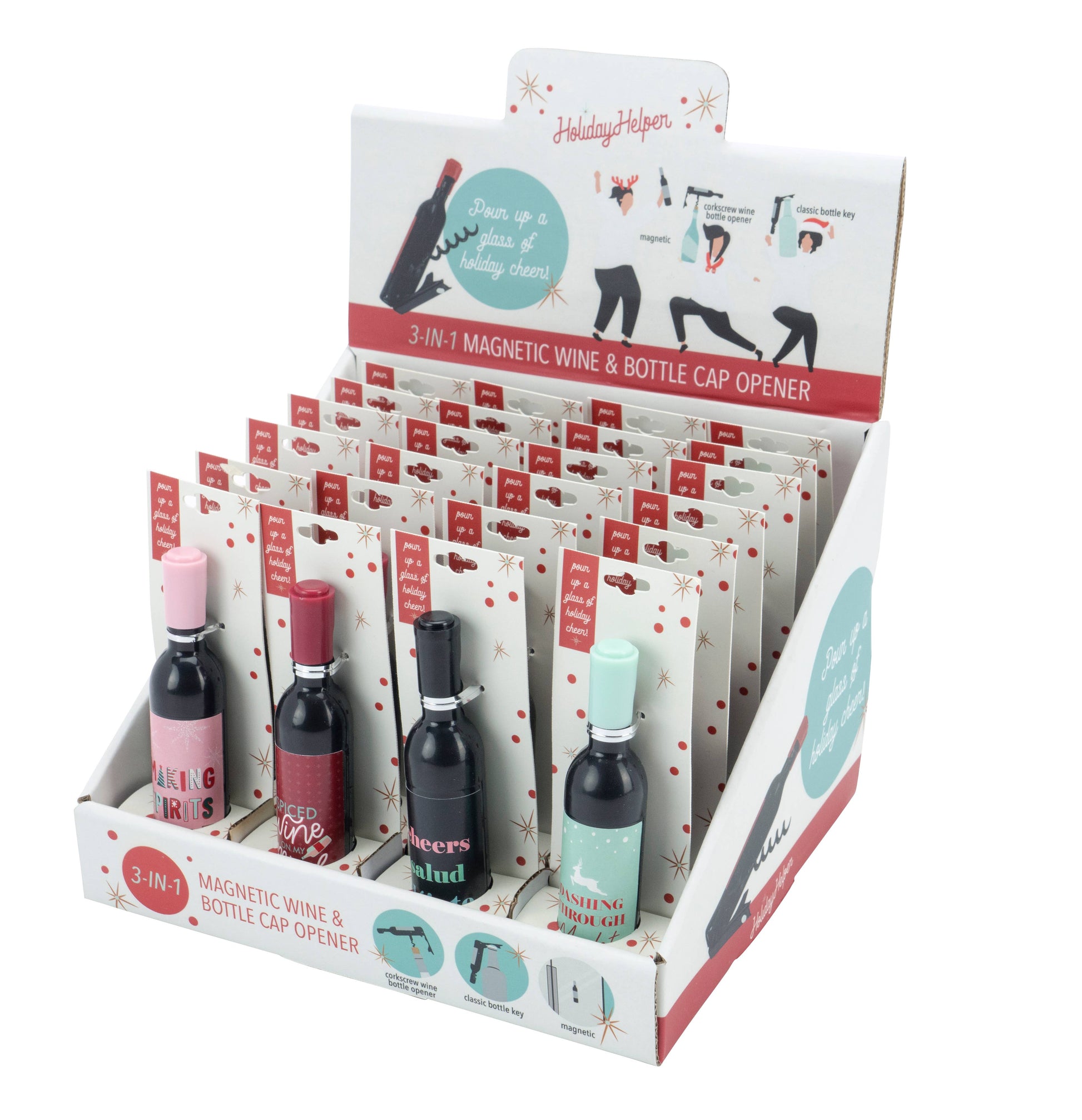 Pour up a glass of holiday cheer with this kitchen and bar cart essential. Miniature bottle design is perfectly sized to house a fold-out corkscrew and bottle key. Perfect for holding up holiday cards when not in use! Great for stockings or gifted with a favorite bottle. -Magnetic mini bottle design -Fold-out corkscrew and bottle key -4 festive designs.