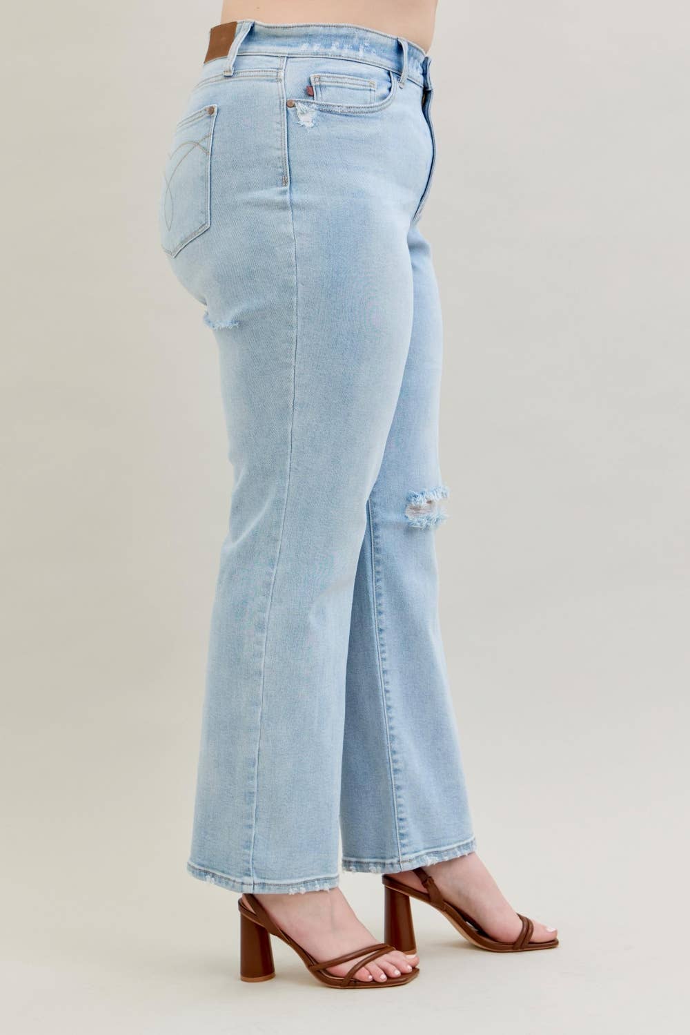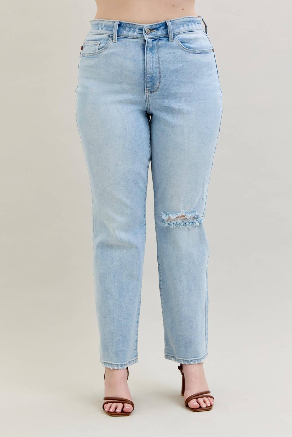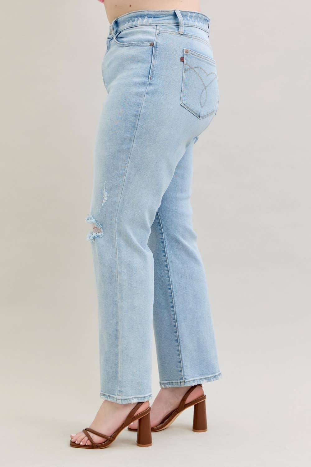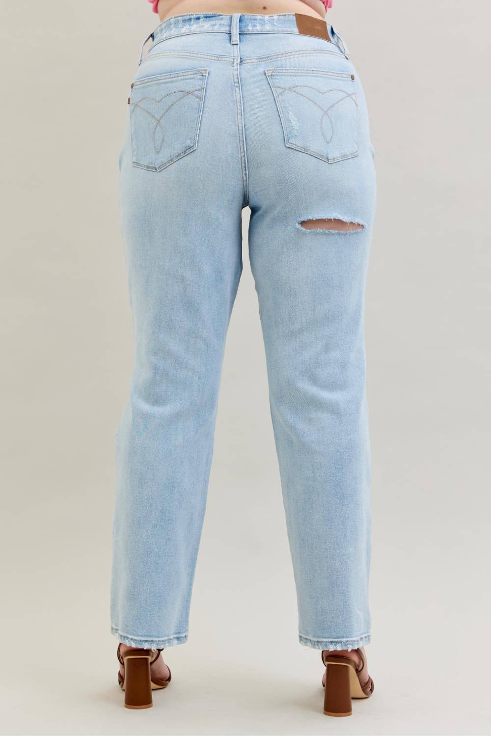 Welcome to Judy Blue Jeans, where denim dreams come true. Our latest offering, the HW Destroy & Back Ripped 90's Straight, is a tribute to the classic era of the 90s. These jeans are a blend of retro style and modern fashion. The destroyed and back ripped details add a contemporary edge. Crafted with our signature blend of quality and comfort, these jeans are not just a piece of clothing, but a part of your style. Elevate your wardrobe with the laid-back, effortlessly chic vibe of California with Judy Blue Jeans.