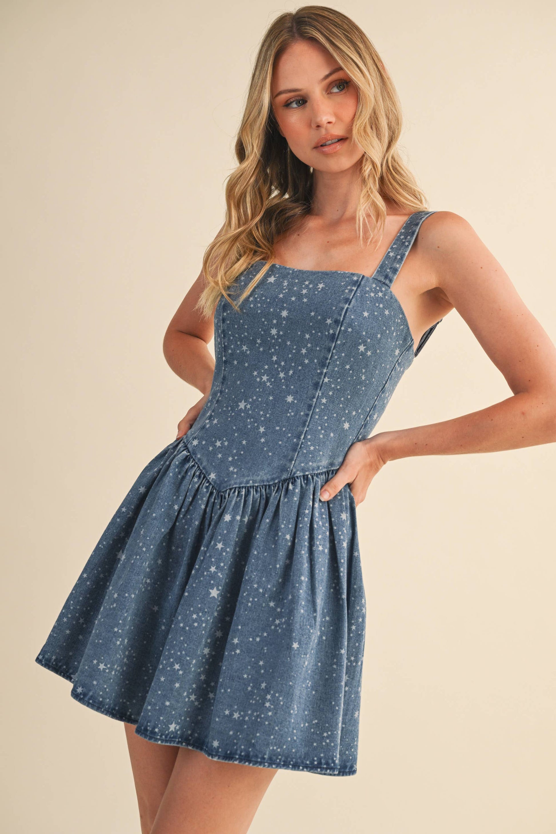 STAR PRINTED DENIM FLARED MINI DRESS. ADJUSTABLE STRAPS AND ZIPPER DETAL ON BACK. MODEL IS WEARING A SMALL. 100%C / L:100%C