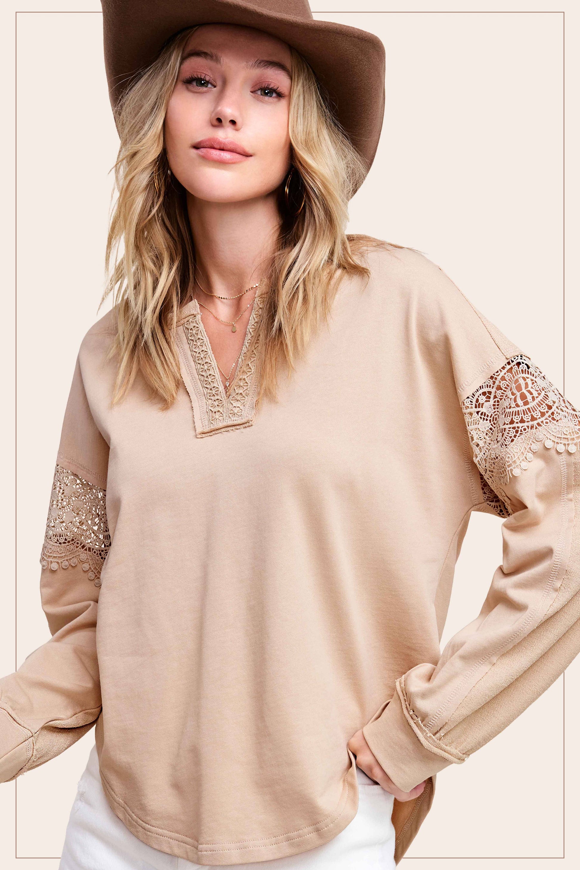 This standout long sleeve top will be a go-to in your wardrobe, featuring a cozy, soft fabrication with a beautiful cutout crochet details on sleeve. Deep V-neck front with a detailed crochet design on, this piece is perfect for any occasion. crochet detail, long sleeve, deep v-neck, lightweight, contrast back detail, raw edge, vintage look, western look, cutout crochet, unique design top.