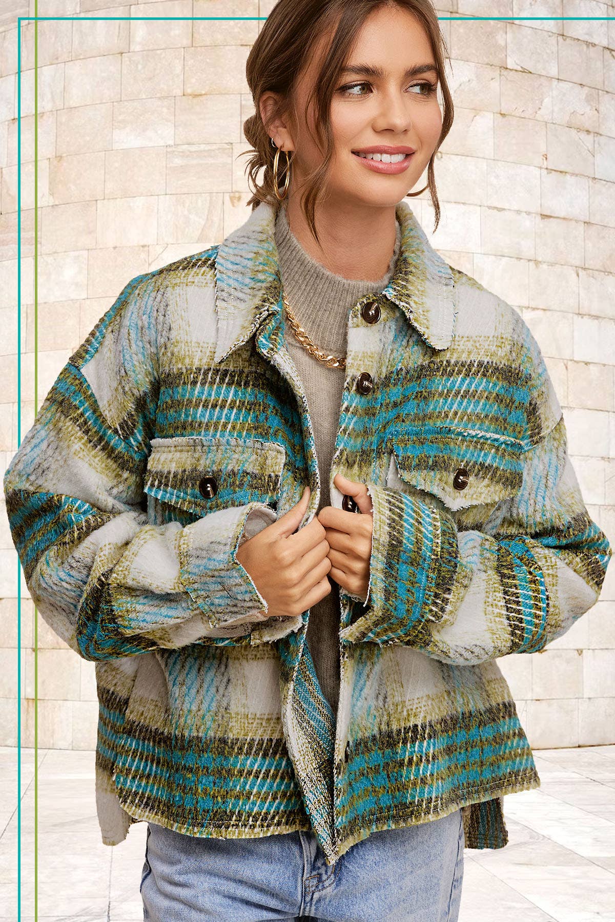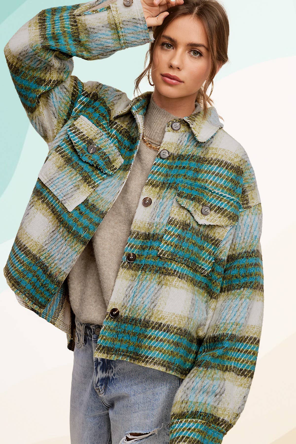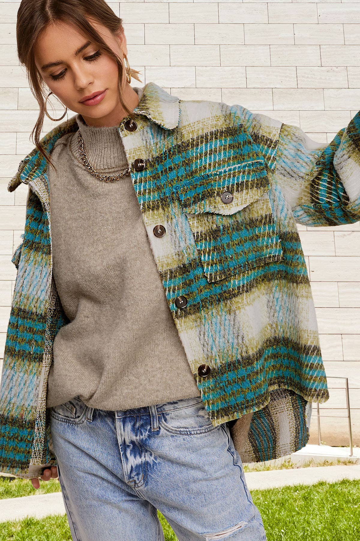 button down front, loose fit jacket, soft brushed jacket, plaid patterned, plaid jackets, boxy silhouette, raw edge detail, chest pockets, easy wear jacket, layering piece, shacket, fall