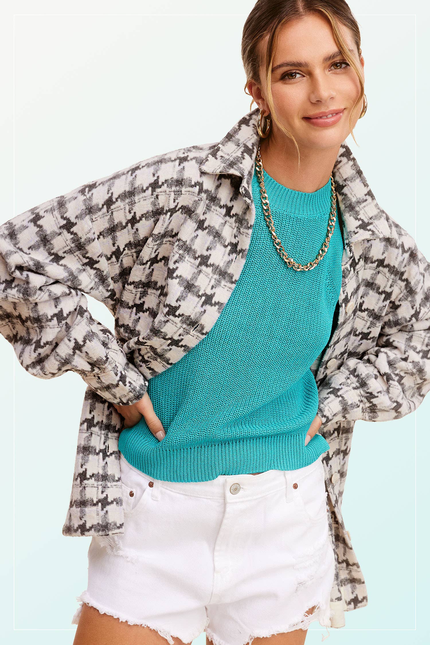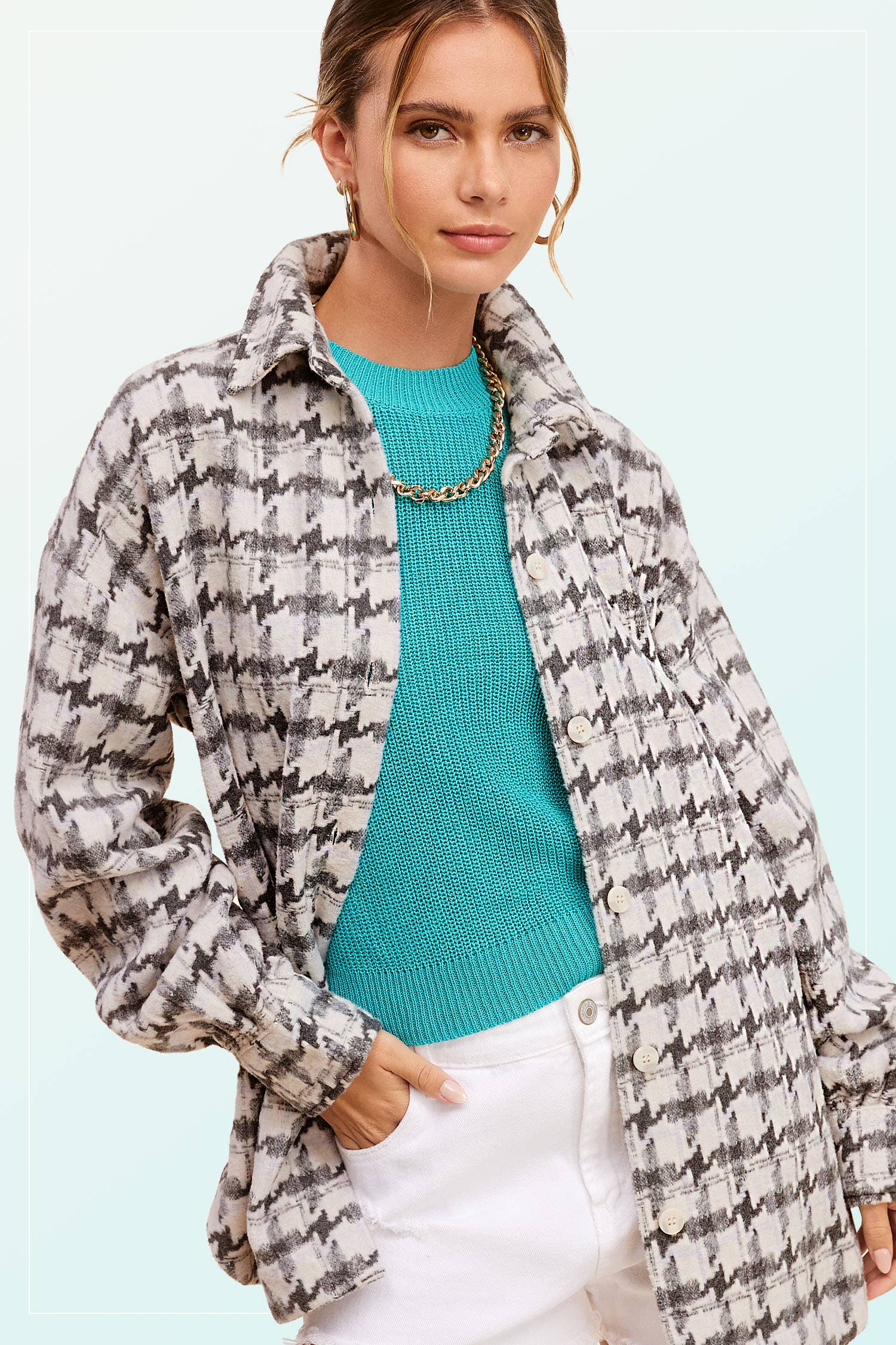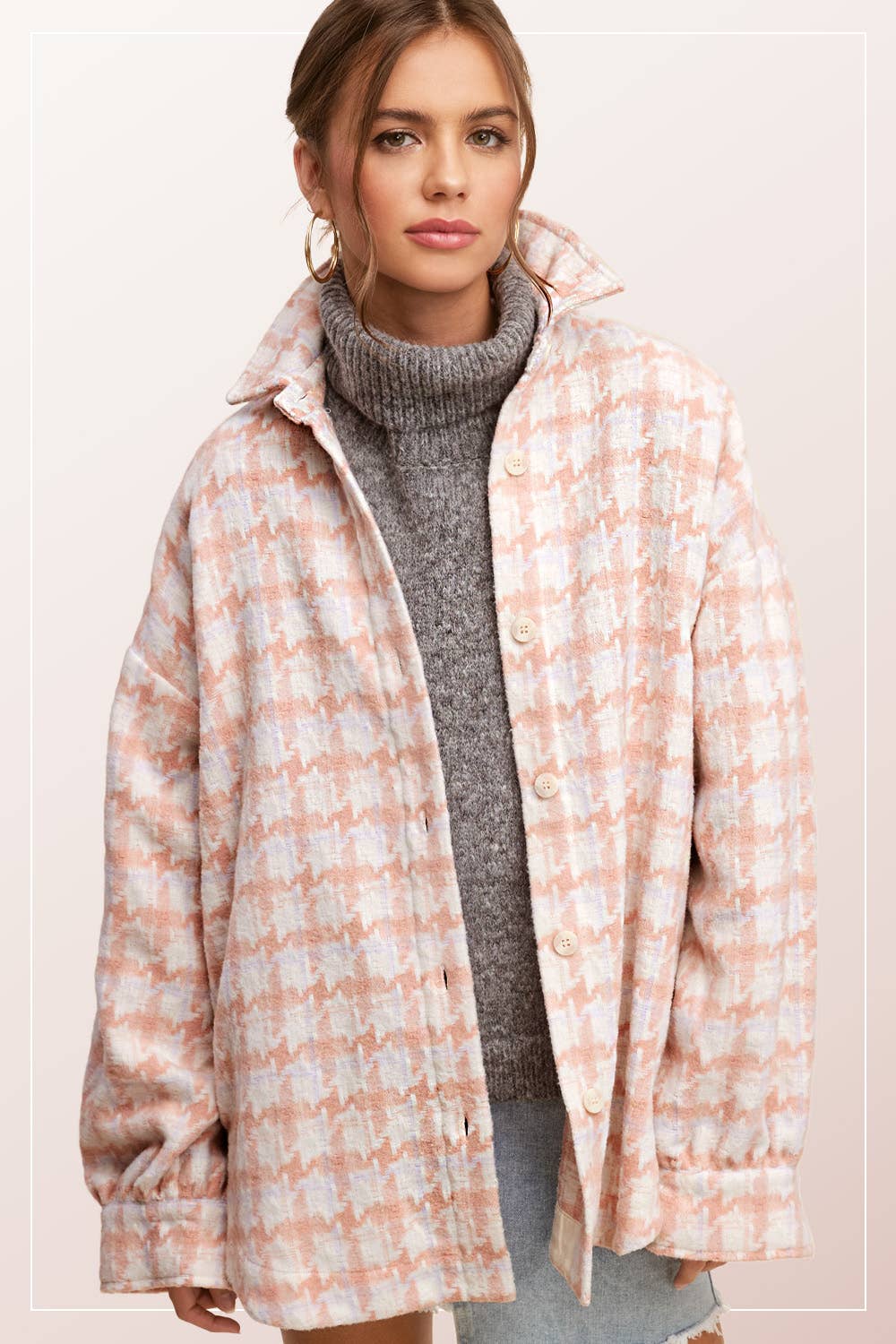 houndstooth pattern jacket, soft brushed fabric, oversized fit, loose fit, layering piece, collared neckline, button down front, cozy outerwear, shacket, fall