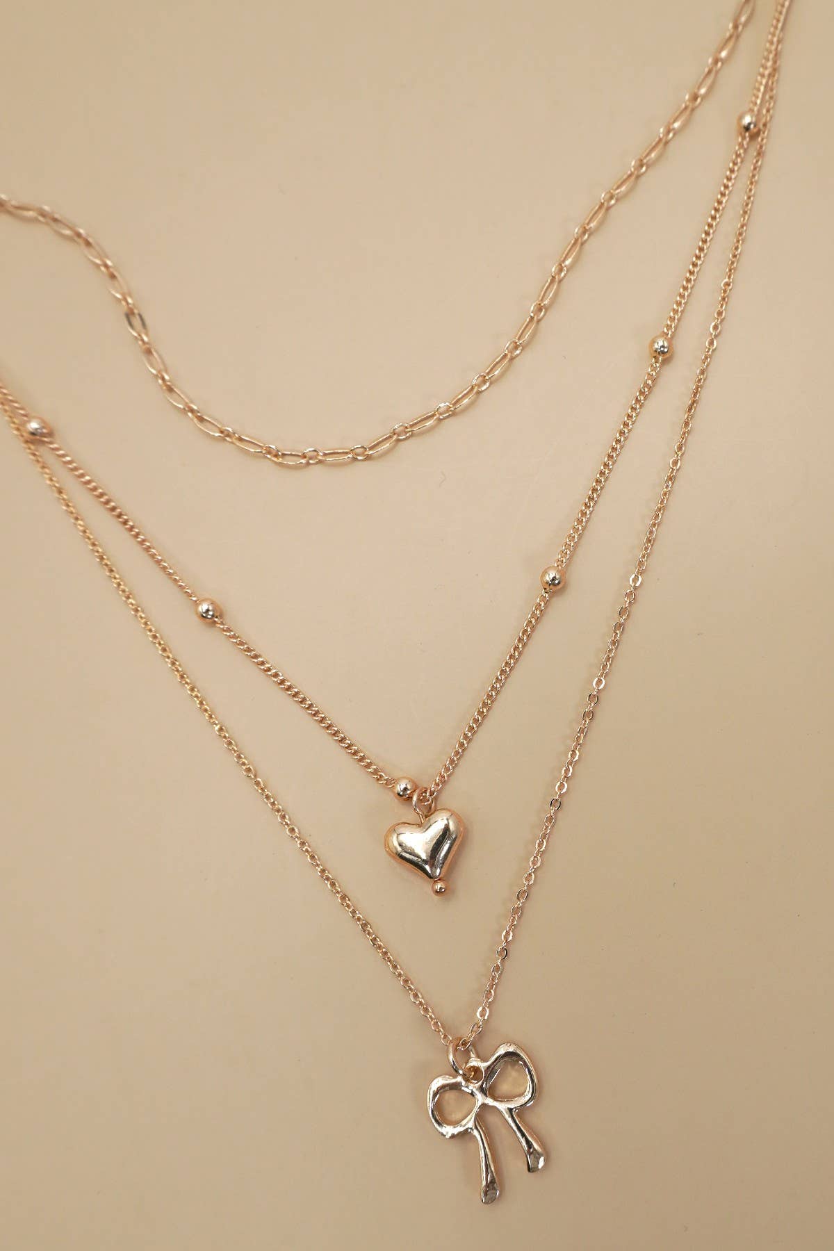 Multi-Layer Bow Heart Charm Drop Necklace, featuring delicate layers of charms, this necklace includes a charming bow and a heart-shaped pendant, crafted with high-quality materials, this necklace offers both durability and style.