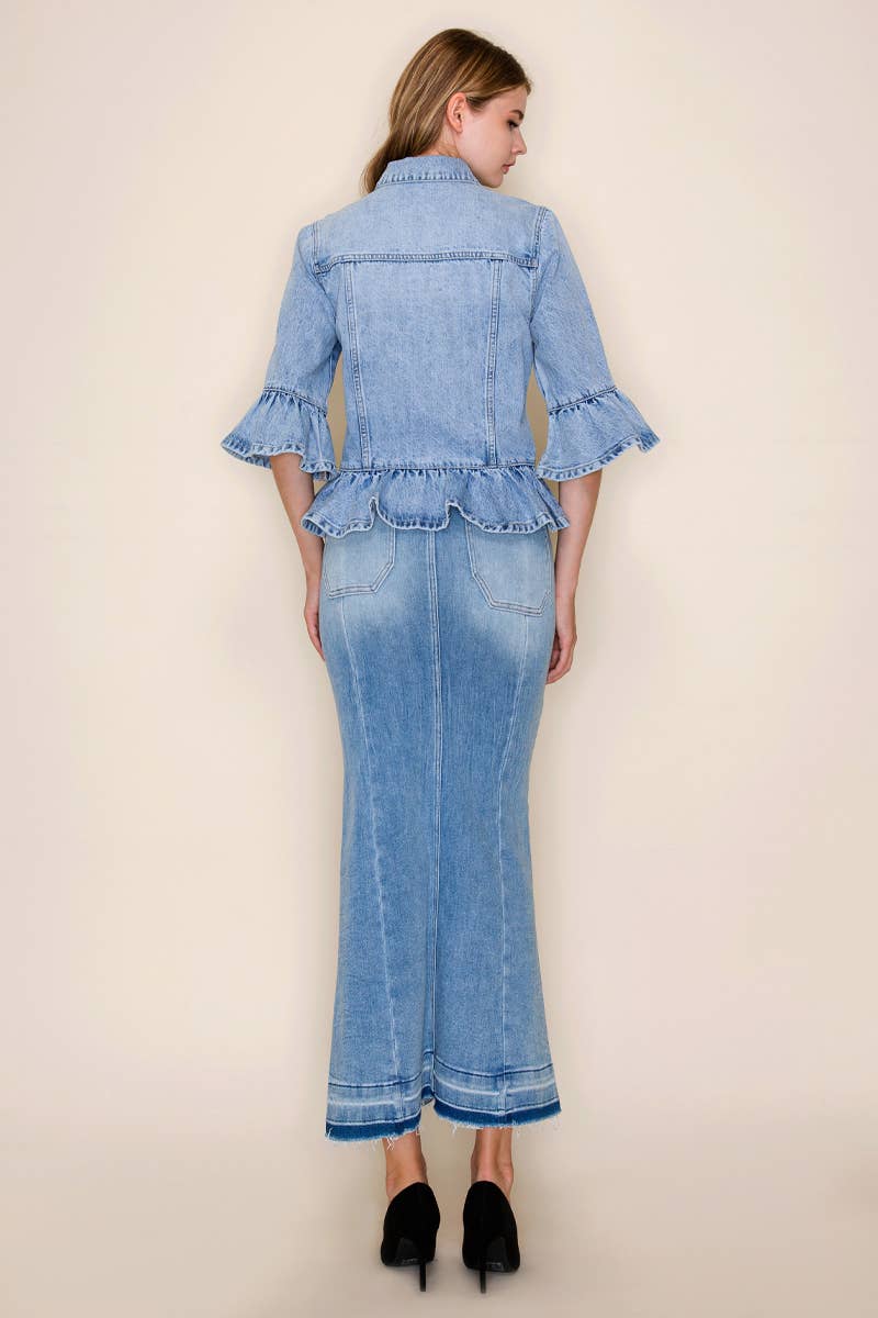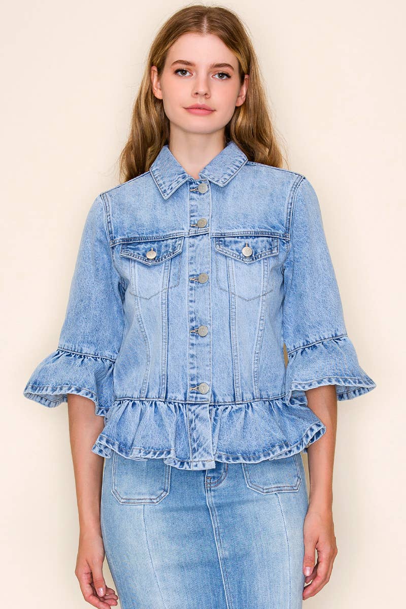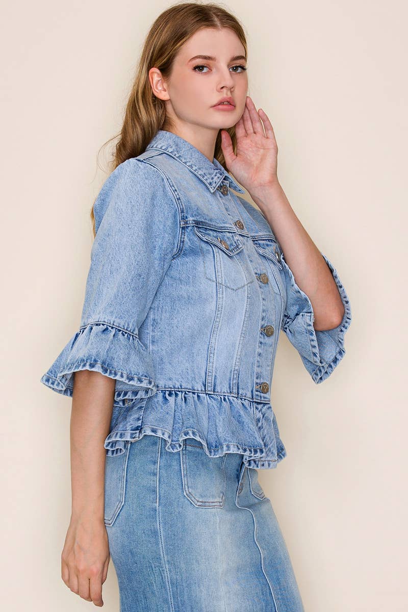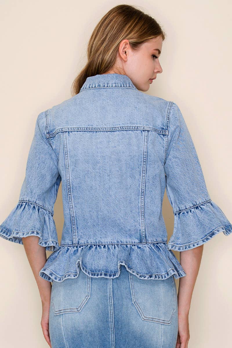 Light Wash Type: Ruffle Denim Jacket Neckline: Shirt Collar Sleeve Length: 3/4 Sleeve Type: Ruffle Sleeve Placket: Single Breasted Fit Type: Regular Fit Fabric: Non-Stretch Material: Denim Composition: 100% Cotton Size S, Model is 5'8" Front Body Length - 23" Chest - 37 1/2" Shoulder Width - 16" Sleeve Length - 15”