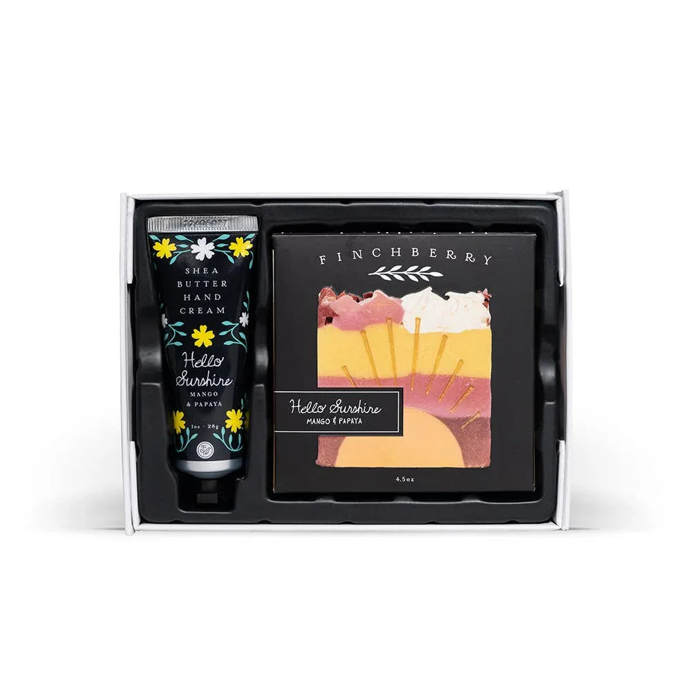 Brighten someone's day with our Sending You Sunshine 2 Piece Gift Set! This delightful duo includes a vibrant Hello Sunshine Soap Bar and a pocket-sized Hello Sunshine Travel Hand Cream, perfect for spreading rays of joy wherever they go. Infused with invigorating citrus scents, the soap bar cleanses and refreshes, leaving behind a sunny fragrance that uplifts the senses. The accompanying hand cream, enriched with nourishing ingredients, keeps hands soft and moisturized on-the-go, while its cheerful packaging serves as a daily reminder to embrace the sunshine in every moment.