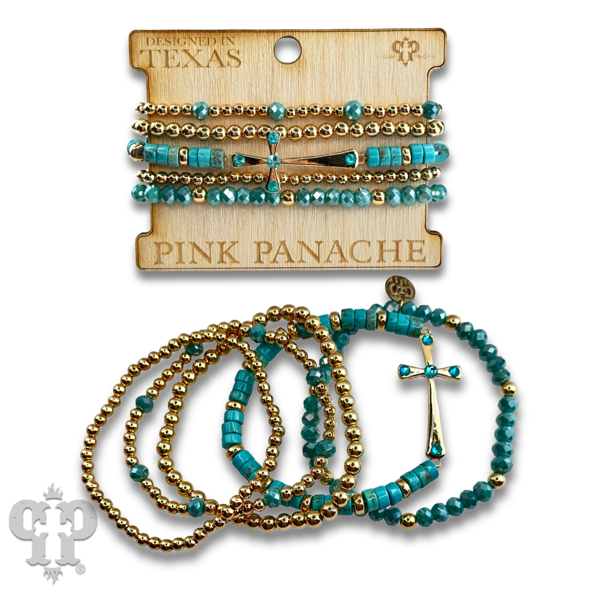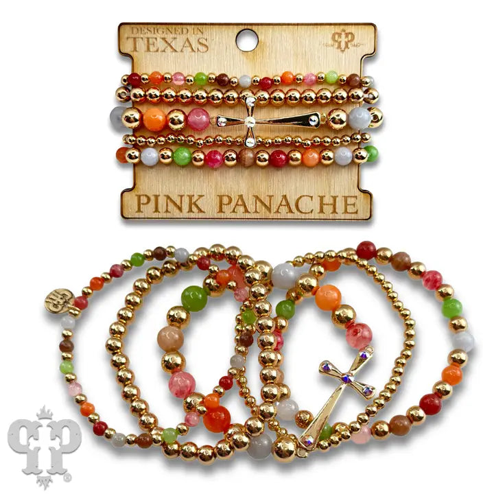 This beaded bracelet features colorful round, barrel and shiny metal tone beads. It features a shiny finish cross charm adorned with handset Austrian crystals.