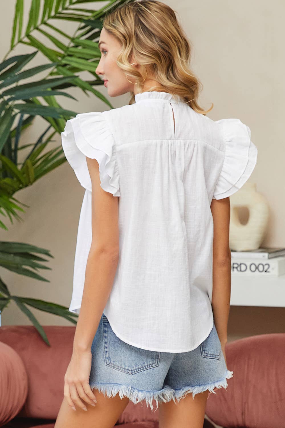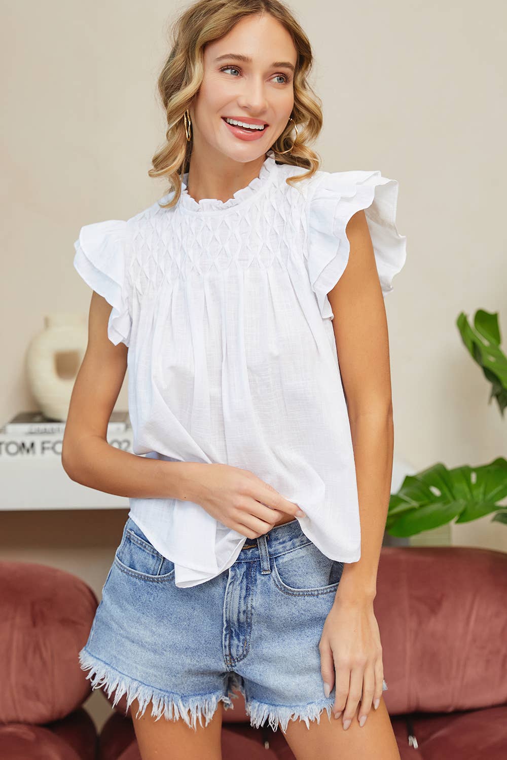 Smoked Ruched Detail at Upper Front. Giving it a Textured Look. Ruffle Sleeves. Open Back Neck with Button Loop. 100% Cotton. Model is Wearing a Small.