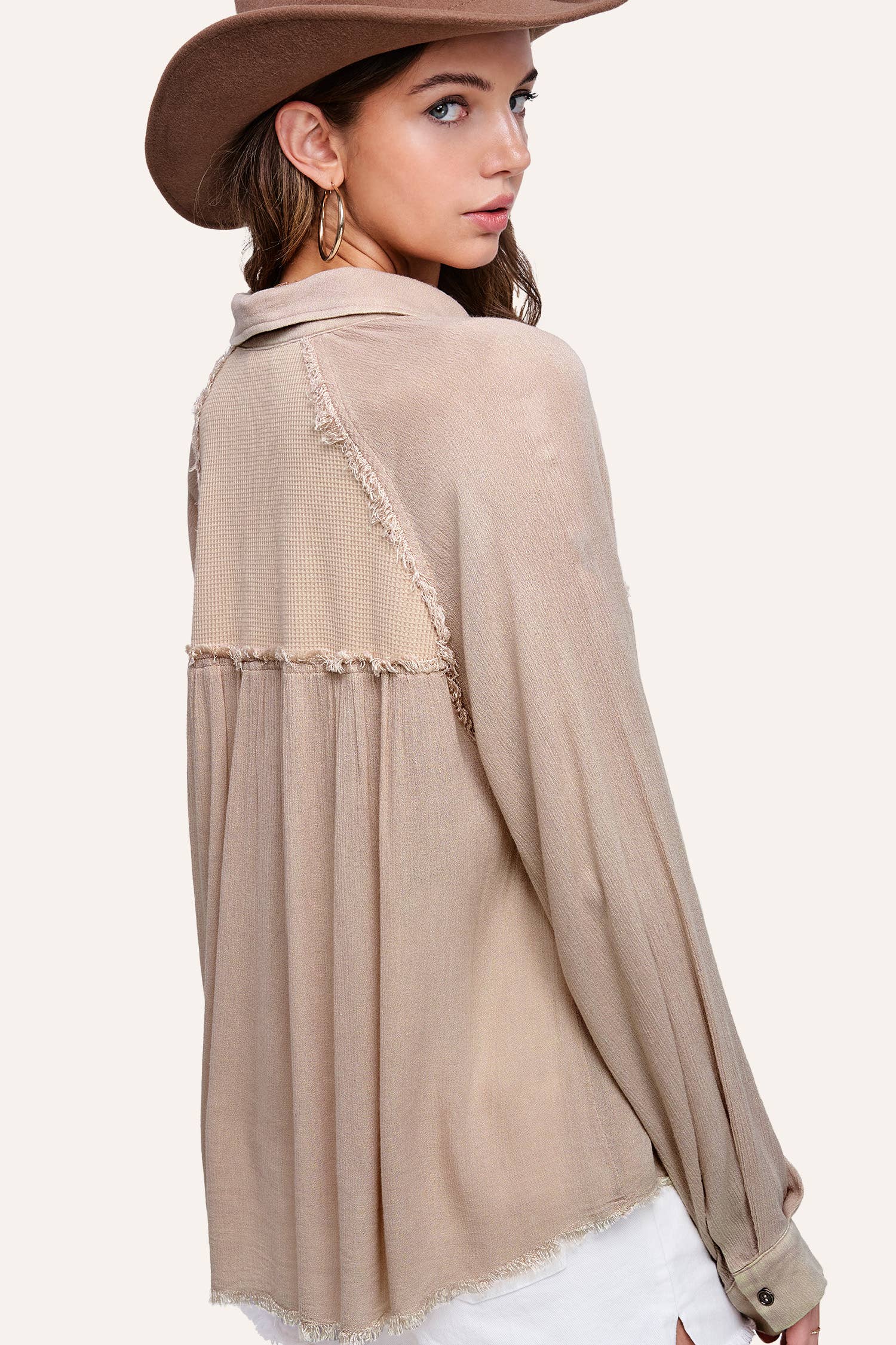 button down shirts, collared neckline, raw edge detail, long sleeve, waffle textured, gauze fabrication, soft washed, layering piece, breathable material