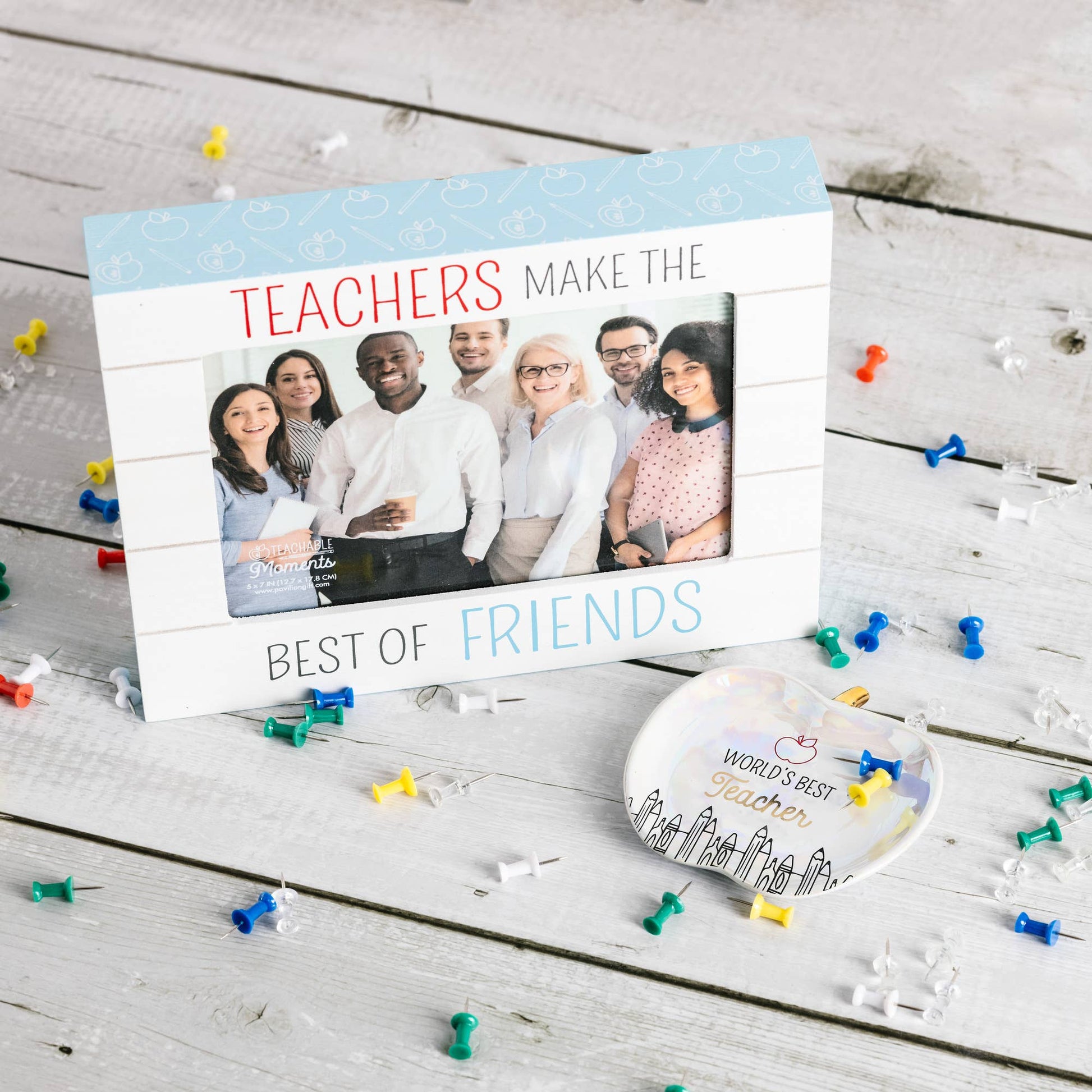 The golden stem apple-shaped 4" desk tray, jewelry, or keepsake dish is made from stoneware. Packaged in a die-cut box. Black pencil, pen, crayon, highlighter, and marker design are accompanied by an electroplated apple and "World's Best Teacher" gold and black sentiment. The beautiful iridescent finish brings this piece a bubbly, classy look. . Wipe clean with a damp cloth. Do not put items in the dishwasher or microwave. Bring a smile to any teacher's face and a place for tacks, paper clips, change, jewelry, or other small items that can be held in their homes or the classroom. They'll be reminded of how much they are truly loved and cherished. Teachers are inspiring, encouraging, caring, smart, and make a lasting impression on our hearts. Give back a small token of appreciation for all they bring to our lives. Great for elementary, middle school, high school, special education, and ESL teachers. Great present for teacher friends too. .